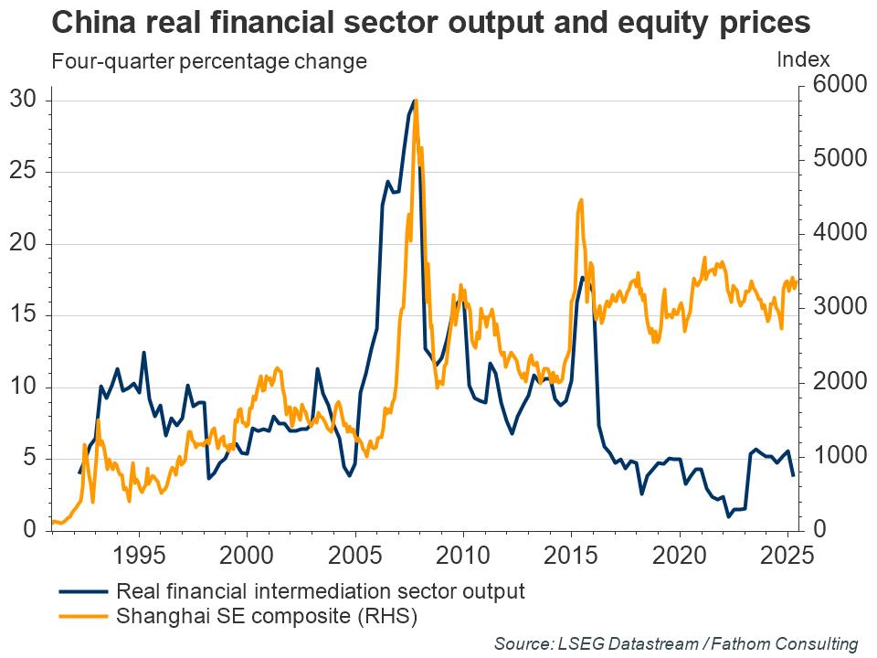 Moreover, we find the strength of the financial services subcomponent difficult to understand. Indeed, with its growth so closely related to China’s equity market performance, it is surprising that the third quarter stock market collapse did not exert more of a drag.