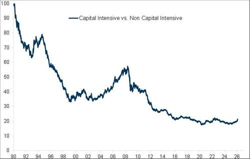 - 15 years ago Andreessen prophetically declared “software is eating the world”; but now there’s a real risk AI eats software… and services… and countless other IP-led profit pools across the market. The extraordinary trend of capital-light companies outperforming asset heavy companies is reversing.