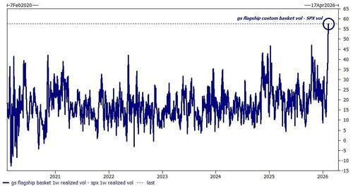 5/ and with full credit to Brian Garrett again: the stability at index level is truly masking the ferocity of the action under the surface – in fact, the volatility of our flagship custom baskets realised at 80 last week, 60 vol points over the index, far eclipsing anything we’ve seen before :