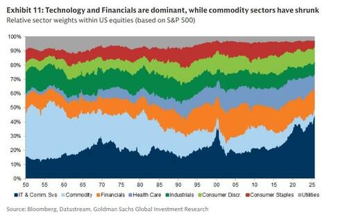 Have a look at the below: tech’s now 44% of the index, while materials are just 2% … Utilities make-up another 2%, energy another 3%; industrials make-up 9%.