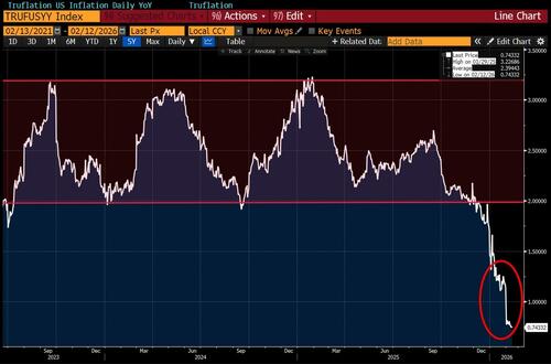 2/ in contrast to most global central banks who have a price stability mandate, the Fed has a dual mandate, and now may be one of the most crucial periods for that dual objective given what’s going on with the labour market. In fact, Navarro and Hasset have been at pains to stress this labour market consideration this week; also, China CPI’s plummeting again (0.2% vs 0.4% expected), and I’m amazed in client conversations how many people still fear an goods driven inflation upside impulse through this year, despite the AI-labour risk, the clear AI-deflation risk, and the implosion lower in nowcast readings of US price pressures (which broke below the stable 2-3% range in December, but then really broke low in early Feb):