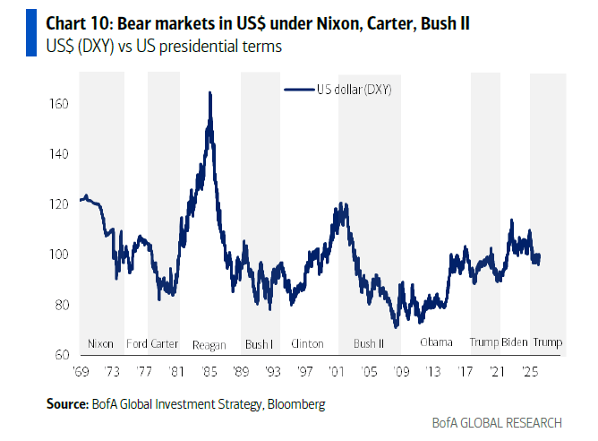 Away from the sharp drawdown in stocks, Hartnett warns that a bear markets in Presidential credibility (more on that below) also means a bear markets in the US dollar (see Nixon, Carter, Bush II);
