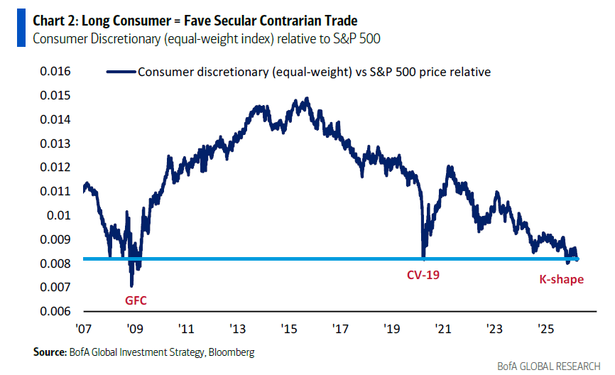 Which brings us to The Biggest Picture of this week’s Flow Show (and which conforms with what we said recently): Hartnett says that consumer discretionary is now at Global Financial Crisis 2008 & COVID 2020 relative lows.