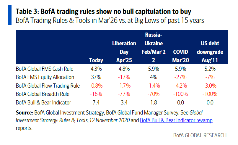 Bull Case = Financial Conditions: any market rally will need easing of financial conditions as global policy coordination to lower oil = rate hikes get priced out, private credit systemic risk eases, yield curve steepens; for Hartnett, the best Q2 contrarian longs for exposure to easing FCI: software, private equity, consumer finance (based on deviation from 50-day and 200-day moving averages, the best metric for fear to buy & greed to sell).
