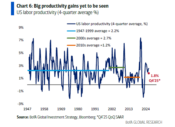 Bear Case = EPS: in this worst case scenario, wider credit spreads and fresh declines in stocks continue until recession and rate hike probabilities stop rising, and stop threatening big cuts to 19% EPS growth global consensus; at the same time, the ballast for bulls of imminent AI productivity gains were damaged by poor 1.8% productivity growth in Q4