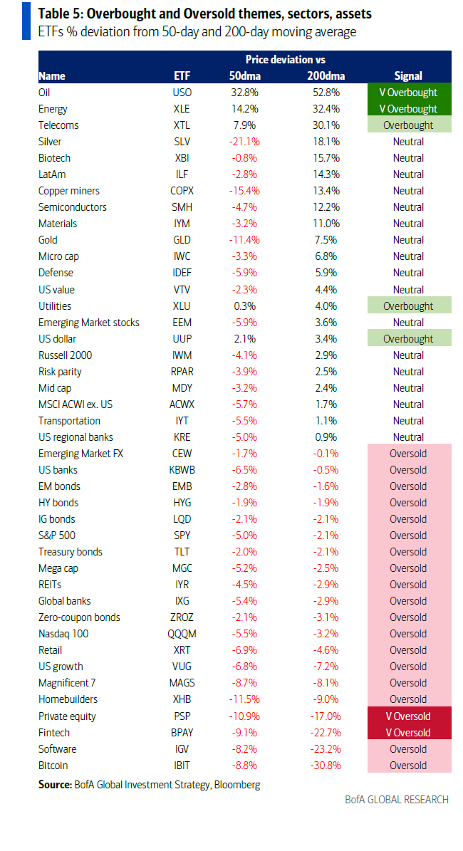 On the bright side, the coming end of the Iran war, US-China trade deal or a Hormuz Strait deal, and a cut in hyperscaler AI capex are all catalysts for risk asset lows… but the longer it takes, the greater probability that risk markets further rotate from boom trades in Q4, to stagflation trades in Q1, to recession trades in Q2… at which point long US Treasuries, short cyclical and liquidity themes still in overbought territory (silver, oil, Korea, LatAm, semis, energy, telecom).
