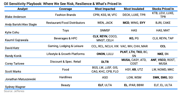 n a note to clients on Thursday, Jefferies’ U.S. Consumer Team outlined which companies are likely to be hit hardest as an energy shock ripples through the economy following nearly three weeks of conflict in the Middle East.