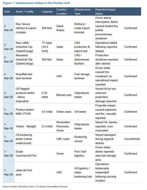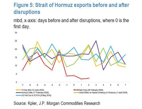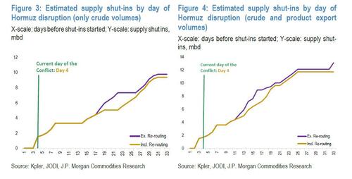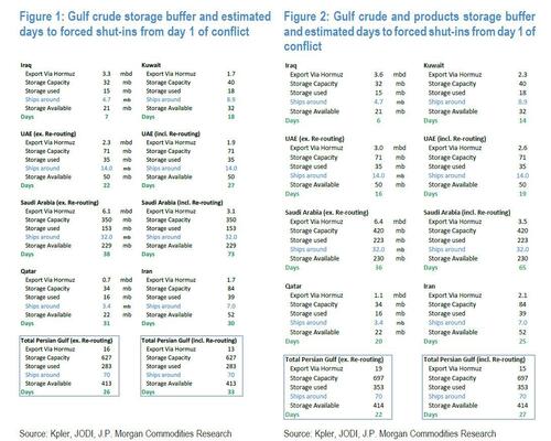 Using storage data from the conflict’s first day, JPMorgan now estimates in a follow up note that Iraq and Kuwait have approximately two and 13 days, respectively, as of Wednesday, until they shut-in the crude supply that is exported via Hormuz. Worse, this is a conservative assessment: it excludes some product storage sites and unassigned ballast vessels within the Persian Gulf, which can be re-routed to either country. Some reports suggest that only six to twelve VLCCs are available for booking.
