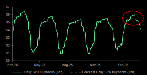 GS: “While we don’t think buybacks are in themselves enough to catalyze a push higher, the removal of these flows would exacerbate an already shaky tape. We expect the next blackout window to start ~3/16 and is expected to run through end of April.”