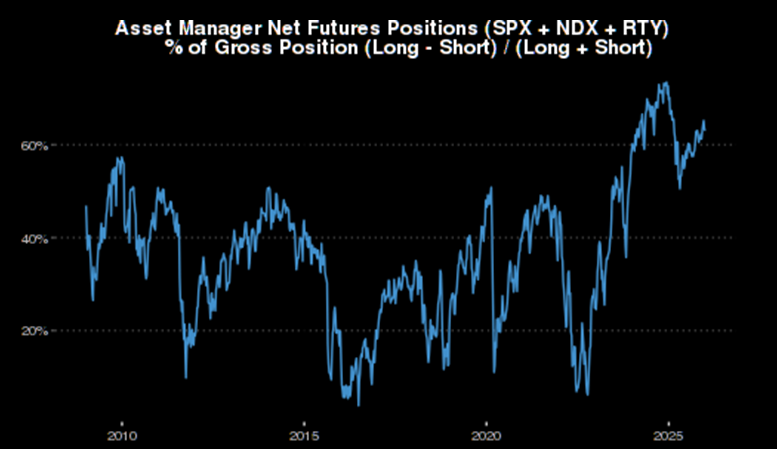 The MS futures team noted on Friday that Asset Managers added $30.5 billion notional of new longs (3% of total open interest) in the two weeks ending February 24 per CFTC data, the most longs Asset Managers added in a two-week period as a % of open interest since January 14, 2018. Looking at futures length another way through the lens of MS Trade Pressure metrics, over the last two months futures demand has been $55bn to buy, a 1.7 z-score amount looking back to 2010. Asset Manager exposure to equities via futures has only been fuller than it is now during 3Q 2025