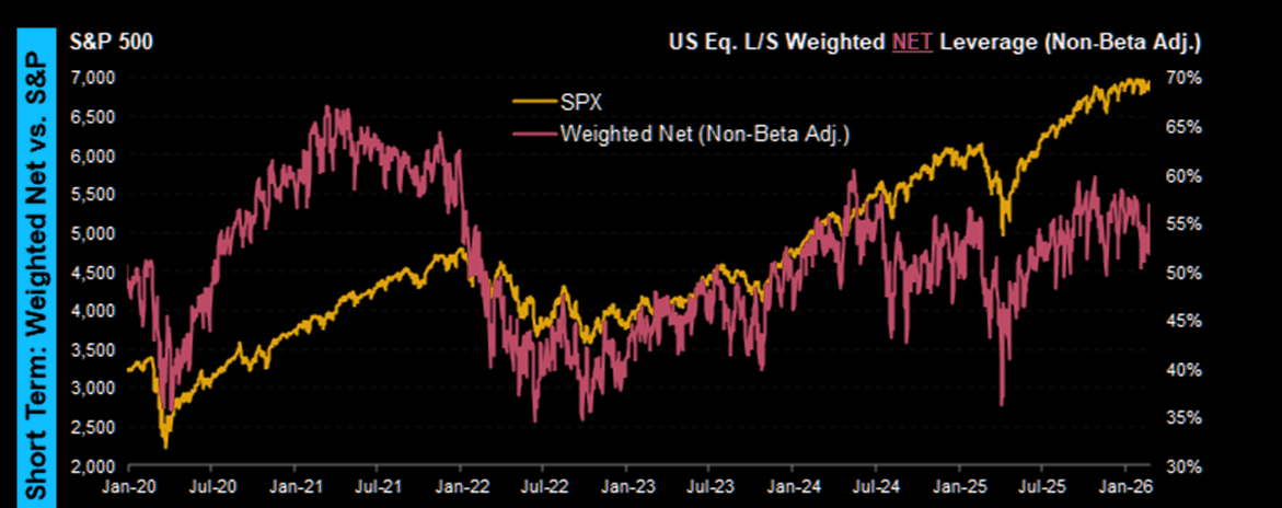 US L/S HF nets are 56%, the 75th %ile versus the last year per MS PB Content. Hedge Funds have generally kept nets in a 49% to 59% range since last April, with flows showing more fragility when nets are in the high 50s while more dip buying in the 49-51% range. At 56% nets are not necessarily in the danger zone, but also have room to move lower as well.