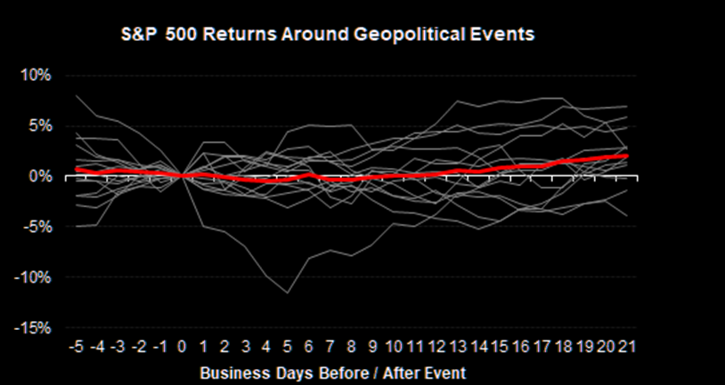 MS: “While this is not an exhaustive study, based on 14 events over the last few decades (generally major, as well as some recent smaller Iran related incidents) the S&P 500 is generally range bound following the start of a conflict. The event causing the largest drawdown in this sample was September 11th, 2001.”