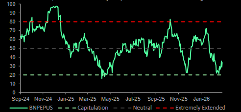 BNP: “Our US Equity Positioning Indicator (BNPEPUS) has come off the lows, now 34/100, in defensive territory despite the market near all-time highs.”