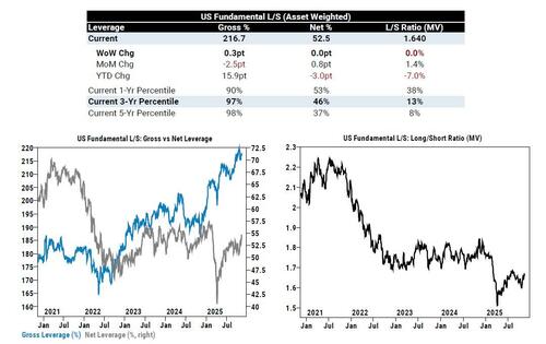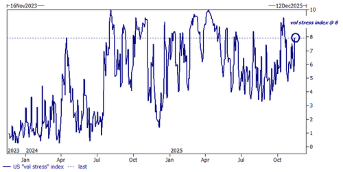 - Derivatives (tech hedges): the desk saw demand for downside hedges in megacap tech (this “rhymes” with the supply in TMT from both prime brokerage and one-delta); the spread of NDX vs SPX implieds is close to 1y highs; the downside in NDX avg stock trades at one of the largest multiples in 2y, and the “vol stress” index is an 8 out of 10.