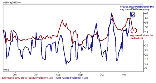 - Derivatives (one stock): Garrett says that he found this interesting, albeit disconcerting: on zero idiosyncratic catalysts, NVDA has been exhibiting higher volatility than the avg stock in the Russell 2000 … reminder, nvda is about 2,500 times the size of the avg stock in Russell ($4.6tr vs $1.7bn) and infinitely more liquid.