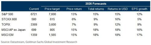 Goldmans 12-måneders aktieprognoser, vægtet efter regional markedsværdi, vil give 13 % prisafkast i 2026, 15 % med udbytte, i USD. De fleste af disse afkast er indtjeningsdrevne.