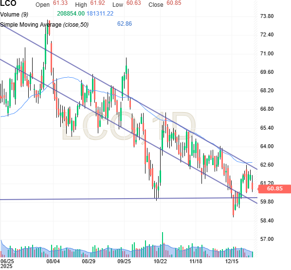 Graf: Oliepriser ligger fortsat i en faldende trendkanal – brud op gennem 62,5 USD for brent vil indikere end trendvending