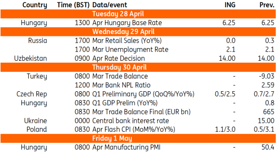 Flash CPI (Thu): The government’s fiscal package includes cuts in excise duty on petroleum and diesel, lower VAT (down to 8% from 23%), and a daily cap price set by the minister of energy, halting further increases in fuel prices vs March. Still, annual growth in fuel prices is projected to be higher than in the previous month due to a low reference base. Elsewhere, inflationary pressure is well contained. Hence, we expect only a small uptick in headline inflation to 3.1% YoY, if any, from 3.0% YoY in March. Core inflation excluding food and energy prices most likely remained at 2.7%YoY this month.