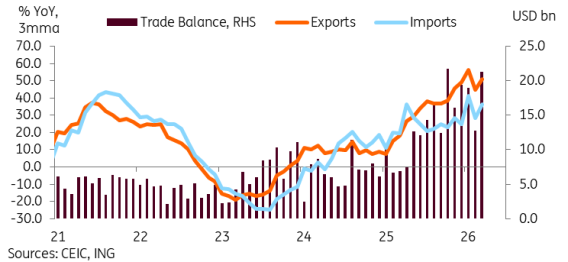 Despite the upside surprise in import growth, the boom in exports far outweighed the faster imports when we look at the trade balance. Taiwan’s trade balance rose to a five-month high of USD 21.3bn, while its 1Q26 trade surplus rose to USD 53.0bn, which was up 124.2% YoY. This outperformance will likely translate to another quarter of double-digit GDP growth when Taiwan reports its 1Q26 GDP growth at the end of April.