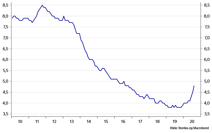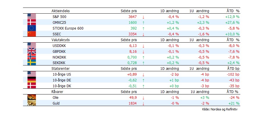 Rentemarkederne afventer onsdagens FOMC-møde. Den lange 10-årige amerikanske statsrente falder lidt tilbage og handler nu omkring 0,88%, hvilket er næsten 10bp lavere end toppen i sidste uge. Den 10-årige tyske statsrente er omkring -0,62%, hvilket er et par bp højere end efter ECB-mødet sidste torsdag.