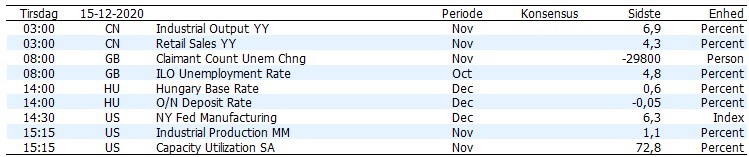 Aktiemarkederne vender pilen nedad. Det er tydeligt, at vi er inde i december måned. Investorerne er hurtige til at justere deres porteføljer. Mandag begyndte udrulning af Covid-19 vaccinerne i USA, hvilket gav positiv åbning af de amerikanske markeder. Dow Jones steg til et nyt rekordniveau, men faldt tilbage og sluttede dagen med et fald på 0,62%. Meget bedre gik det ikke for S&P 500, der faldt med 0,45%. Kun Nasdaq formåede at fastholde en stigning på 0,5%. Bekymring for et stigende antal smittede og nye restriktioner er med til at dæmpe begejstringen ved udrulningen af vaccinerne. Antallet af døde af Covid-19 i USA har nu passeret 300.000.