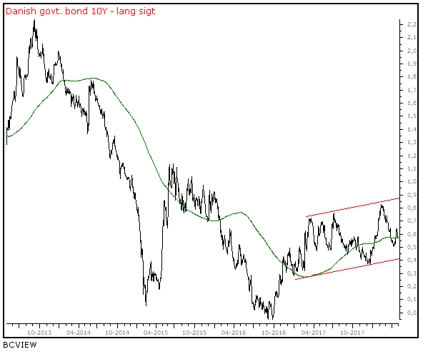Renten standsede faldet lige under midten i den stigende kanal med loft i 0,876% og bund i 0,409%. Den efterfølgende stigning var dog beskeden, og bragte ikke renten op i den øverste del af kanalen. Det ligner en kort pause inden et nyt fald, som sender renten ned mod 0,40%.