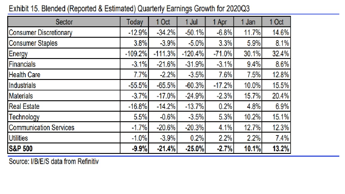 Kursgraf: På blot en måned er analytikernes samlede forventning til Q3 regnskaberne fra de amerikanske S%P 500 selskaber ændret fra minus 21 % i EPS udvikling, til minus 10 %