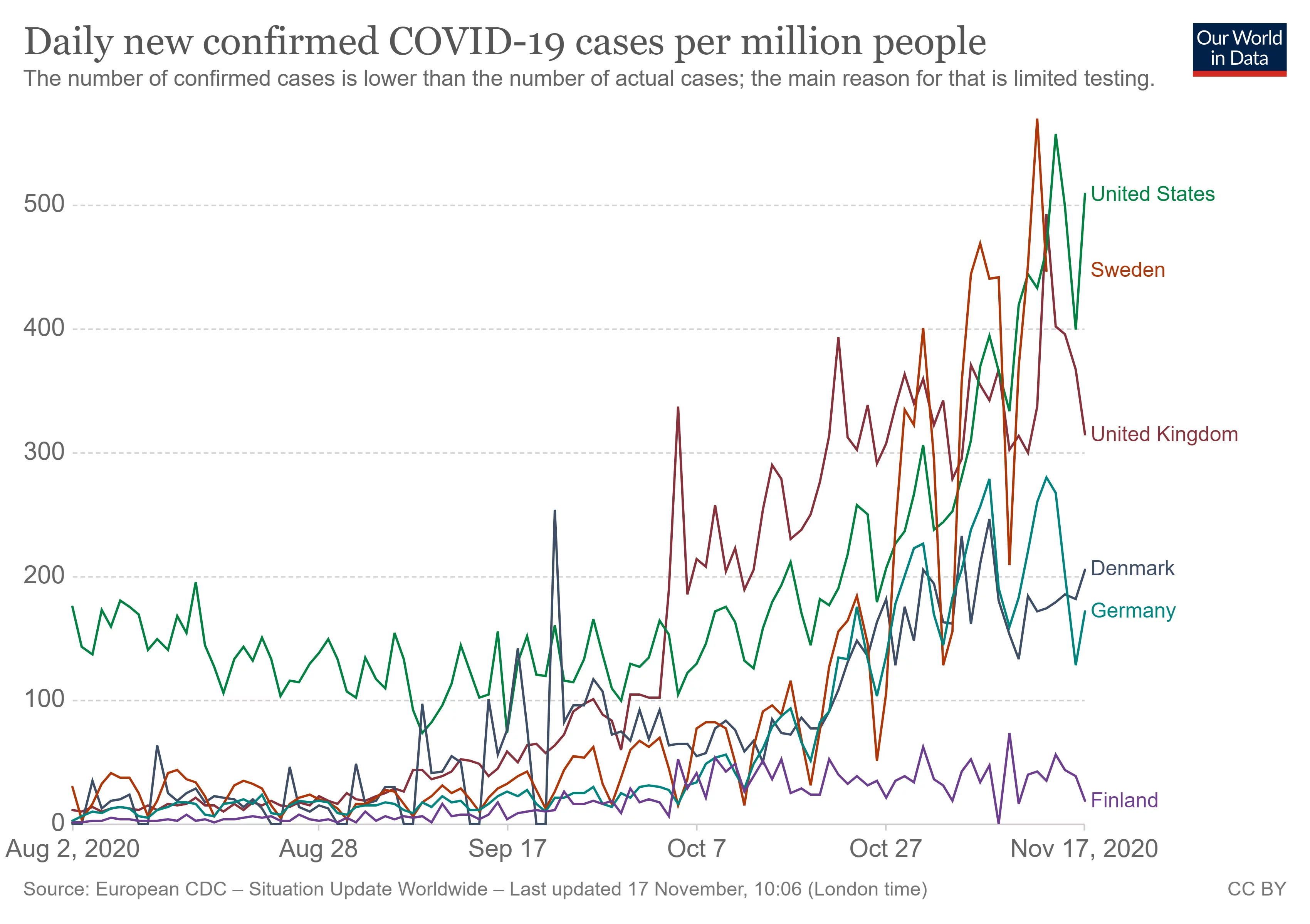 Graf: nye smittede per million indbyggere.