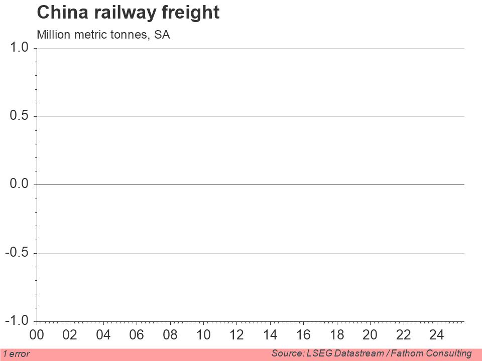 Our CMI combines rail freight volumes, electricity production and nominal bank lending; all three of which were identified by Premier Li Keqiang as providing a better gauge of economic activity than the official estimate of GDP. Both electricity production and rail freight volumes have weakened markedly, with the latter now at a six-and-a-half year low.