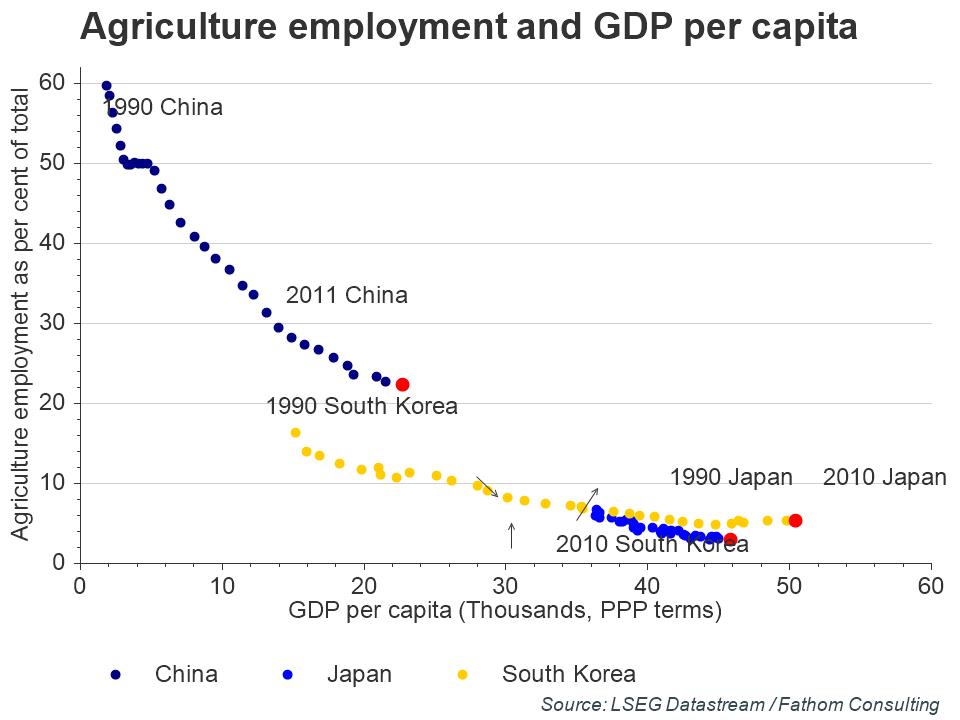 In the case of China, one side of this equation gives grounds for cautious optimism. As economies develop, the proportion of the total workforce employed in agriculture tends to fall as labour migrates to other sectors, such as manufacturing, where the level of productivity is higher. As our table shows, a worker employed in China’s secondary industries is, on average, more than four times as productive as a worker employed in China’s primary industries.