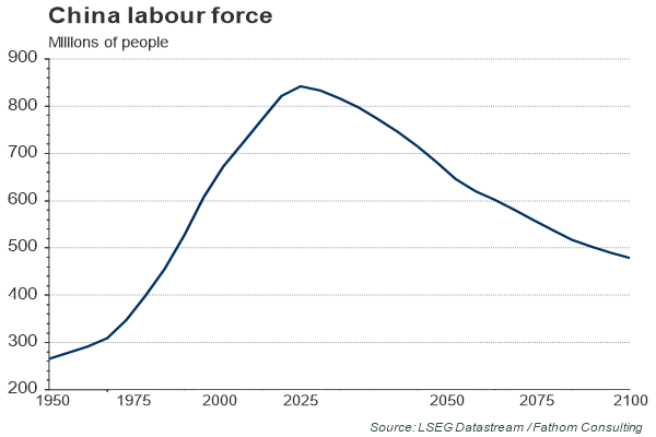 t is likely that China’s labour force has already peaked. We estimate that demographic factors will subtract close to one percentage point from China’s sustainable rate of growth over the next five years. Much has been made of recent plans to reform further China’s one-child policy. But in truth, China has not pursued a strict one-child policy for more than 30 years. The latest changes by themselves will not and cannot defuse China’s demographic time bomb – the fuse was lit long before the ‘one-child’ policy was introduced in the late 1970s. Based on official estimates, which see the new ‘two-child’ policy adding 30 million to the labour force by 2050, what might have been a 19% slump in the size of China’s labour force over the next 35 years will instead be a mere 16% collapse.