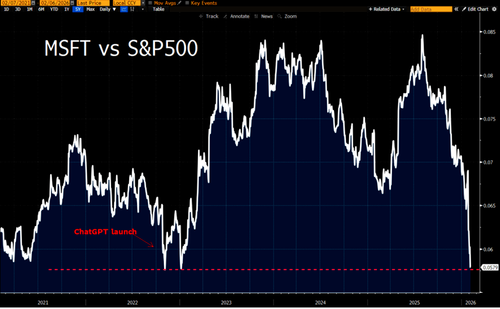 Microsoft har nu givet al sin relative outperformance i forhold til S&P500 tilbage fra november 2022. Aktien handles nu ned med 30% fra sine rekordhøje niveauer. Er nok nok?