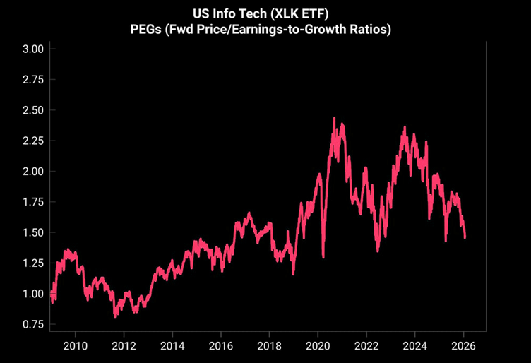 Amerikanske tech-aktier har allerede oplevet en betydelig nedgradering, hvor forward PEG-forhold nu handles tæt på 5-års lavpunkter. “Skummet” er i vid udstrækning kommet ud af sektoren, på trods af at den langsigtede væksthistorie er intakt.