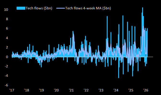 Kortsigtet trendændring i teknologistrømme: Største tilstrømning til teknologi i 8 uger (diagram 1).