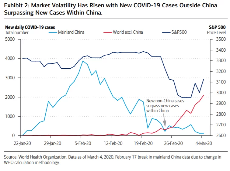 Corona-udviklingen i og uden for Kina og aktieudviklingen (S&P500):