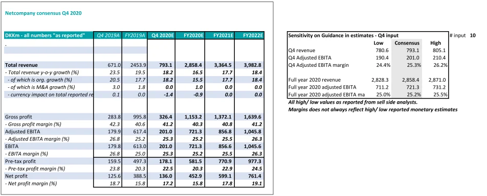 Kommentar: Analytikerne forventer et “nettoresultat” på 136 mio. kr. i Q4-20. Dette skal ses i forhold til et “nettoresultat” på 125,6 mio. kr. i Q4-19. Tallet er forbedret på baggrund af en forventning om en markant stigning i “omsætning”.