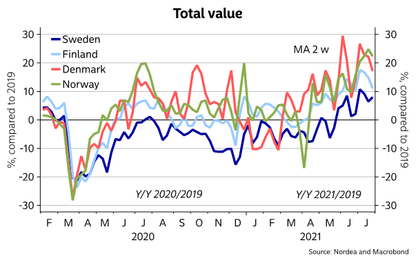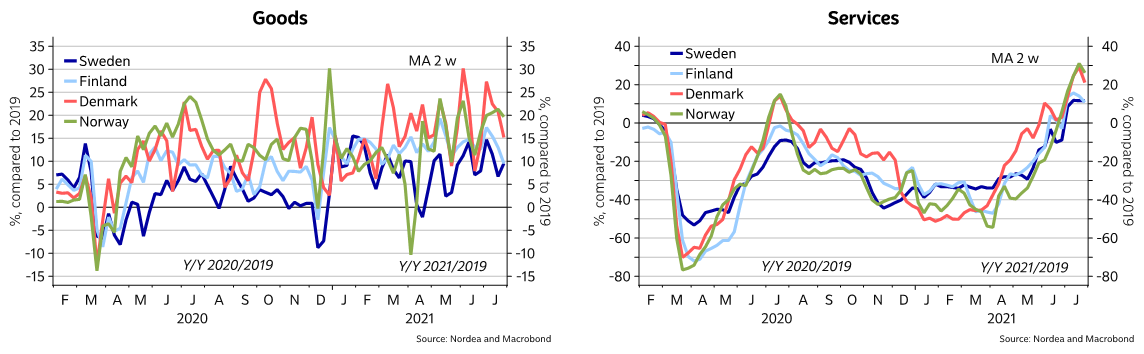 In order to promptly analyse real-time effects on economic activity, it is essential to have access to card transaction data which give an accurate representation of developments on the consumption side. Nordea’s Nordic card transaction data are exceptionally well suited for this purpose.