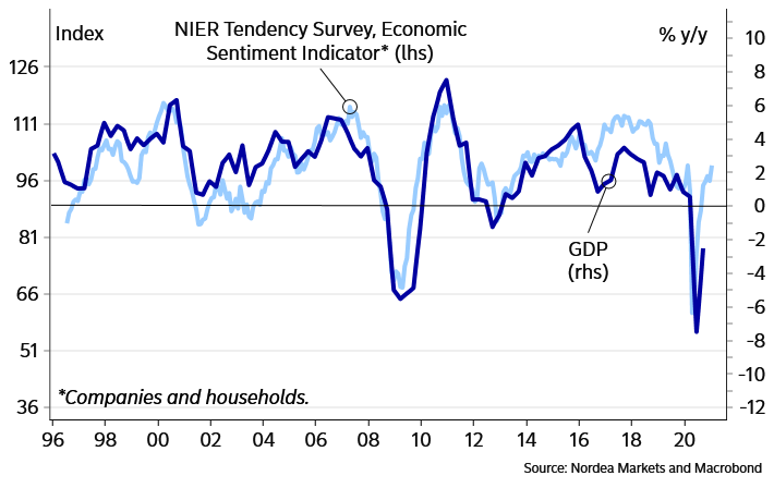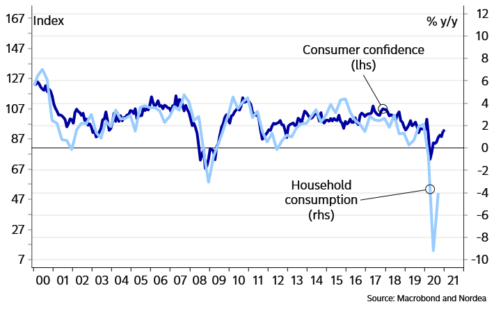 • All in all, the survey is better than expected. The survey suggest that companies and households are seeing through the current second wave of Covid-19, supporting our view that GDP will not decline neither in Q4 nor in Q1. The economy and the labour market are much stronger than the Riksbank’s forecast.
