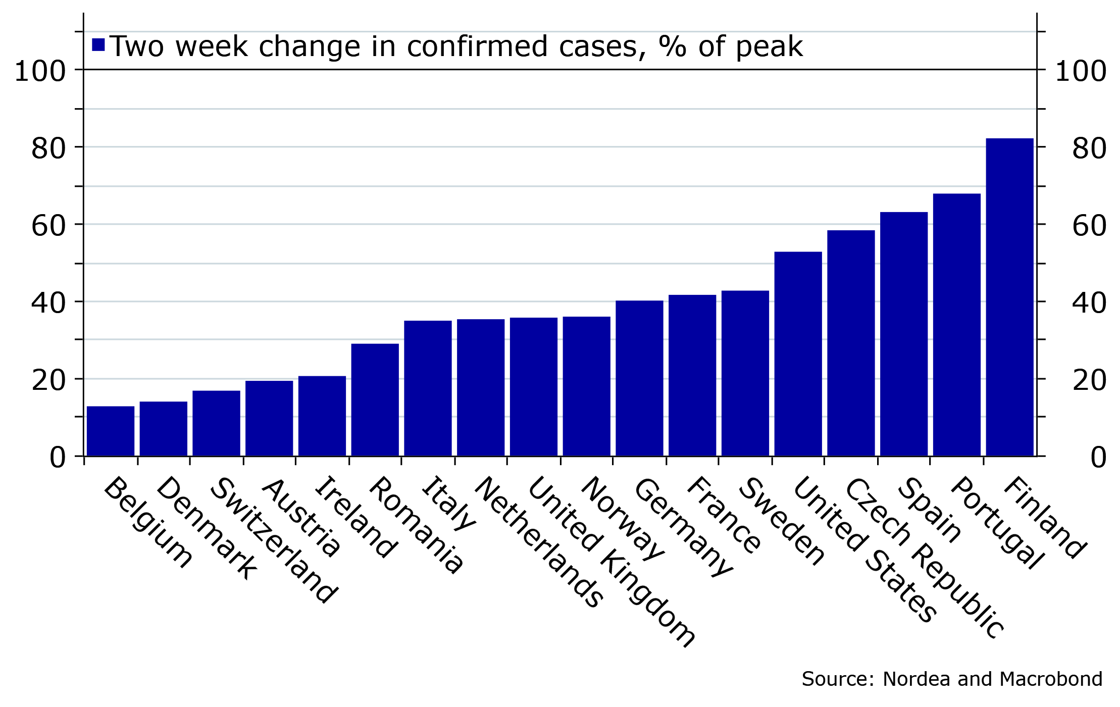 Chart 4. Change in cases over the past two weeks as % of peak of the pandemic