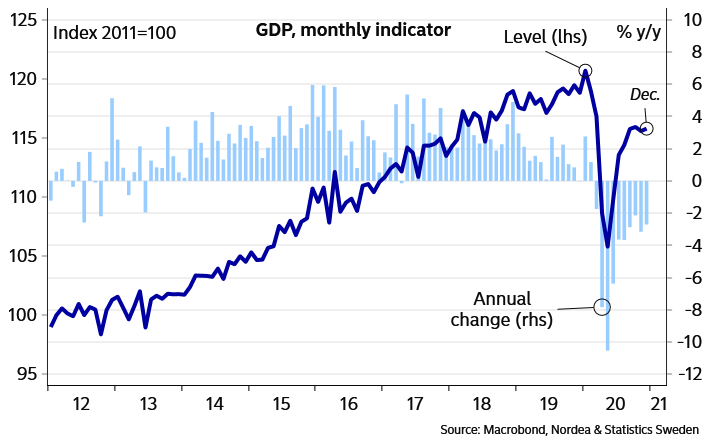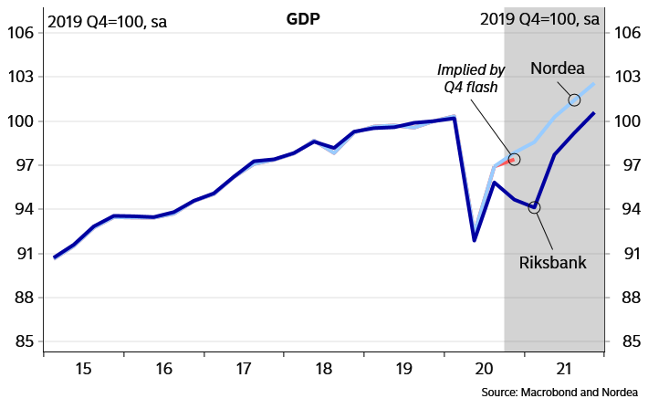 The outcome was below our call but nevertheless well above the Riksbank’s forecast. Numbers for Q3 were revised upwards in late November, and Q4 was much stronger than the bank’s view. The Riksbank’s forecast for Q4 was -1.2% q/q and -5.3% y/y.