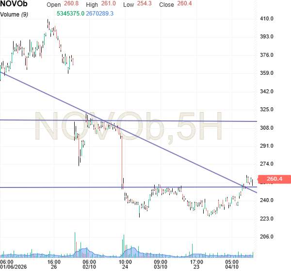 Kursgraf: Det tekniske billede for Novo Nordisk er på det seneste betydeligt forbedret. Hvis det vigtige pejlemærke i 250 holder (det er lige netop brudt opad), ser vi test op mod 310 inden for de næste 2-3 måneder, I ØU Forsigtige Portefølje vil vi begynde at hjemtage gevinster omkring 290-300.
