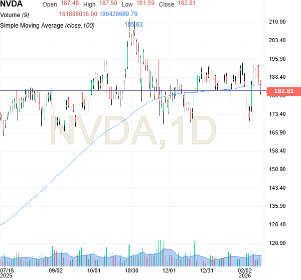 Kursgraf: AI frontløber Nvidia er igen tæt på en test af 180 pejlemærket – med en kurs på 182 i eftermarkedet. Stigende skepsis over Mag7-selskabernes massuve investeringsplaner.