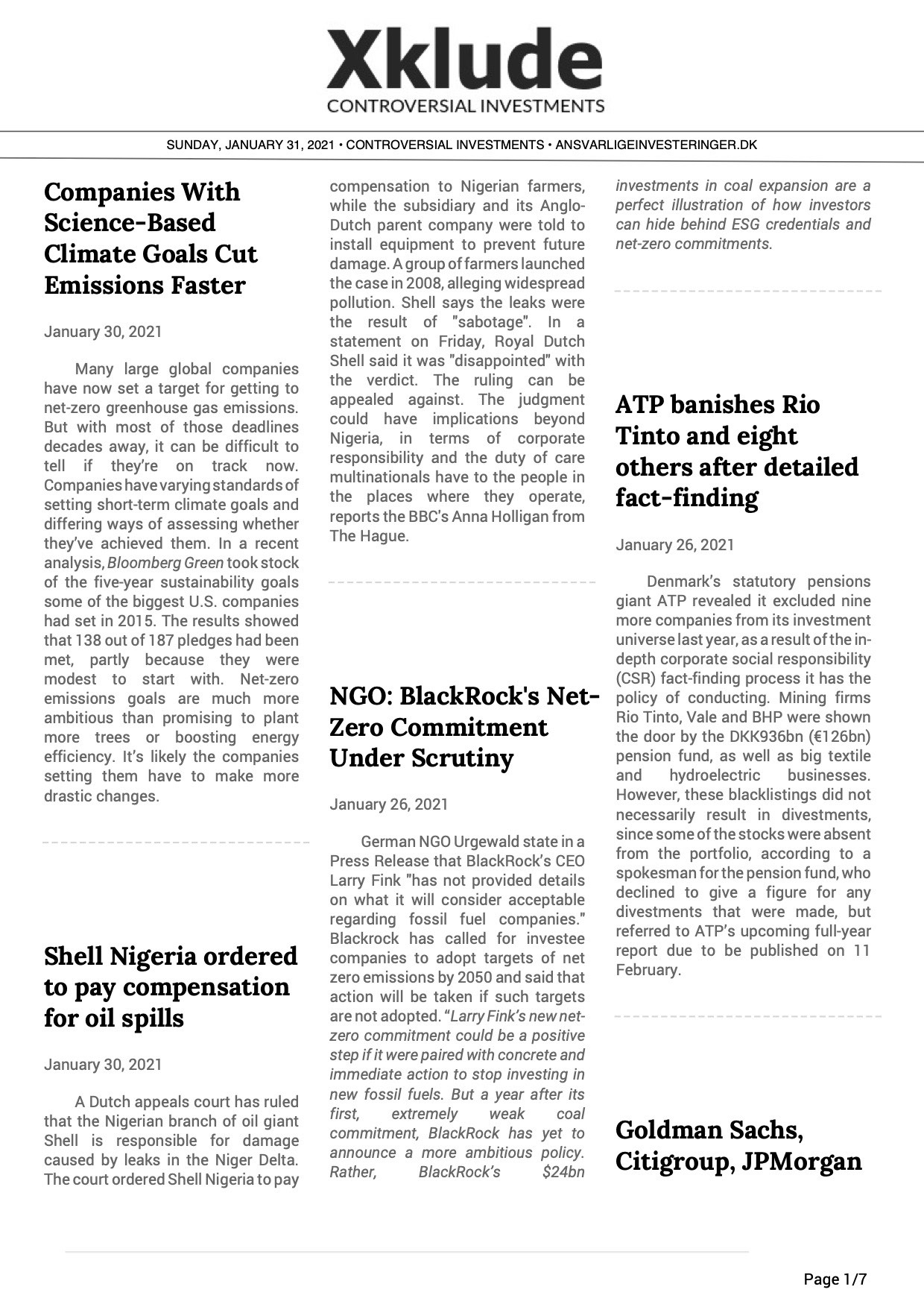 Økonomisk Ugebrevs analyseredskab Xklude.com har udgivet en oversigt over januar måneds væsentligste nyheder om kontroversielle investeringer. Oversigten giver indsigt i mere end 40 forskellige kontroversielle sager i en række store globale børsnoterede selskaber.