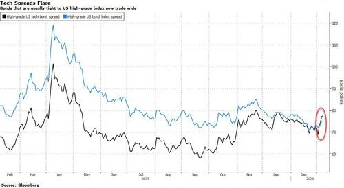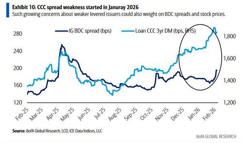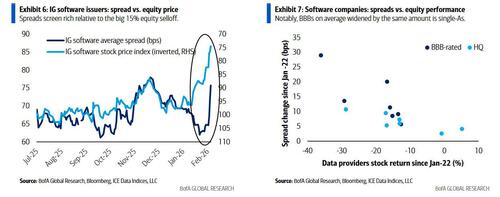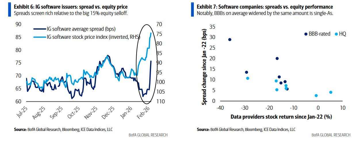Virksomhedskredit er ganske vist ikke immun over for AI’s forstyrrelser: som BofA Credit Strategist Yuri Selger skrev fredag , er spændene for IG-softwareudstedere (f.eks. MSFT, ORCL, IBM) faldet med 14 basispoint siden 22. januar 2026, hvor spændene nåede de højeste niveauer siden november 2025,  da BBB’er i gennemsnit udvidede sig med det samme beløb som single-As.