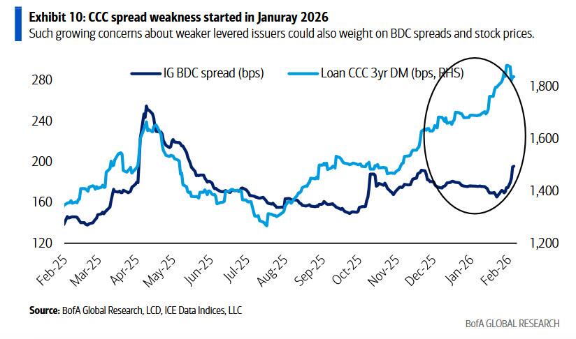 Derudover begyndte CCC BSL-lånespændene at udvide sig allerede i januar, da bekymringer om svagere gearede udstedere også ville tynge BDC-spændene og aktiekurserne.