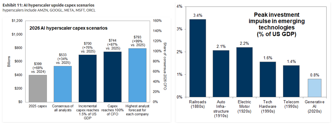 Angsten for capex er forståelig: da Kapa-niveauet på 700 milliarder dollars, hvis det nås, effektivt er 100 % af hyperscaler-pengestrømmene, og denne type udgifter registreres tæt på den maksimale investeringsimpuls, der i alt udgjorde 1,4 % af BNP i slutningen af ​​1990’erne (om end stadig under den industrielle revolution).