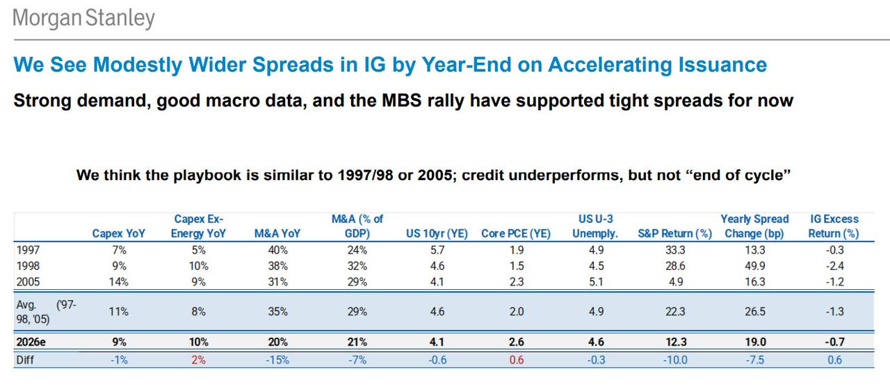 Morgan Stanley er på samme side og forventer også, at hyperscaler-selskaber vil låne 400 milliarder dollars i år, hvilket er mere end en fordobling fra 165 milliarder dollars i 2025. Udbudsbølgen vil sandsynligvis drive udstedelsen af ​​​​højgradige virksomhedsobligationer til et rekordhøjt niveau på 2,25 billioner dollars i år , skrev Vishwas Patkar, chef for amerikansk kreditstrategi i banken, i en obligatorisk note mandag ( tilgængelig for professionelle abonnenter ).