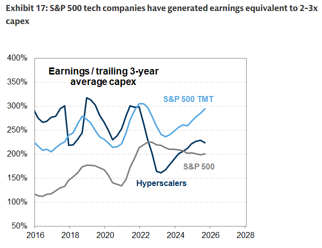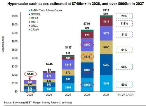 Bank of America forventer optimistisk, at disse udgifter primært vil blive finansieret af kontanter fra driftsaktiviteter for de fire store hyperscaler-selskaber, men banken er hurtig til at bemærke det formindskede overskud fremadrettet, bortset fra Microsoft, selv med ingen/langsommere tilbagekøb i 4. kvartal 2025. Desuden vil forhøjelser af kapitaludgifterne i de efterfølgende kvartaler have direkte konsekvenser for gældsudstedelse, medmindre hyperscaler-selskaberne trækker aggressivt ned på deres kontantbeholdninger (de fire store havde 420 mia. dollars ved årets udgang 2025 vs. 346 mia. dollars ved årets udgang 2024). For at føje til disse bekymringer indikerede Meta potentialet til at blive nettogældspositiv på et tidspunkt i stedet for nettogældsneutral (og det udelukker Metas enorme og voksende forpligtelser uden for balancen).