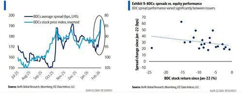 … mens softwaresvagheden samtidig spredte sig til BDC’er, da BDC IG-obligationsspændene udvidede sig omtrent i tråd med svagheden i aktierne med en bemærkelsesværdig spredning i spændperformance.