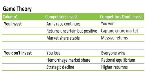 En anden måde at analysere den nuværende matrix af resultater på er gennem spilteori: Hyperskalerere står over for et strategisk binært valg – at investere eller risikere at sakke bagud,  hvilket også garanterede den truende tsunami af gæld, som igen garanterer en gældskrise på et tidspunkt i fremtiden . Risici ved ikke at investere inkluderer:
